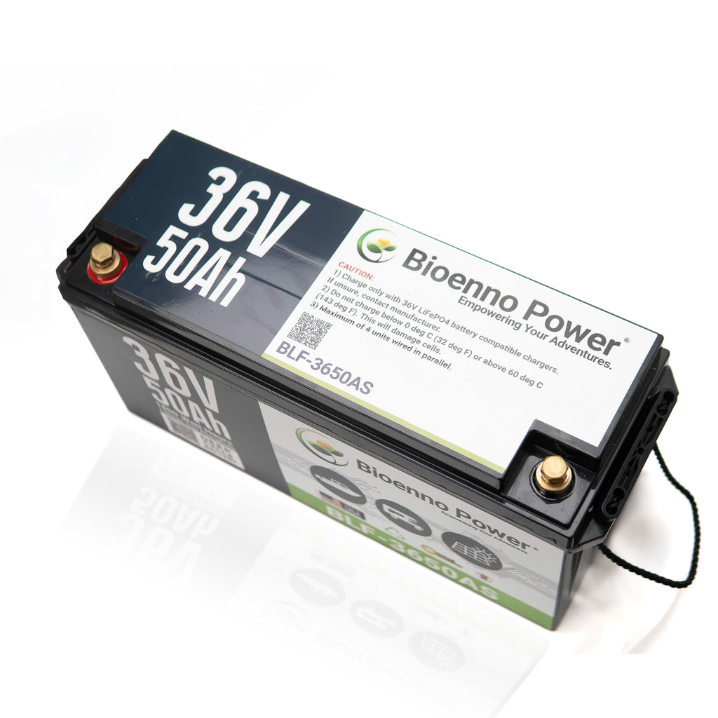 The Bioenno Power Lithium Iron Phosphate (LiFePO4) Battery Model BLF-3650AS is a high-capacity 36V 50Ah battery designed to support demanding high-voltage applications. It provides a powerful 1800W output and is housed in a rugged ABS-sealed case, delivering long-lasting, maintenance-free performance with over 3,000 charge cycles and up to 20 years of service life.